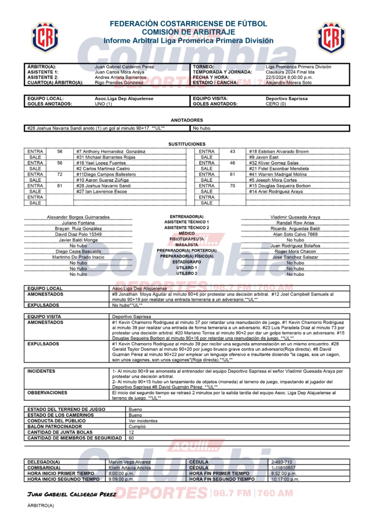 Columbia Deportiva tuvo acceso al documento elaborado por los silbateros. Además de los lanzamientos de objetivos, se detalle las razones de las expulsiones de tres jugadores de Saprissa.