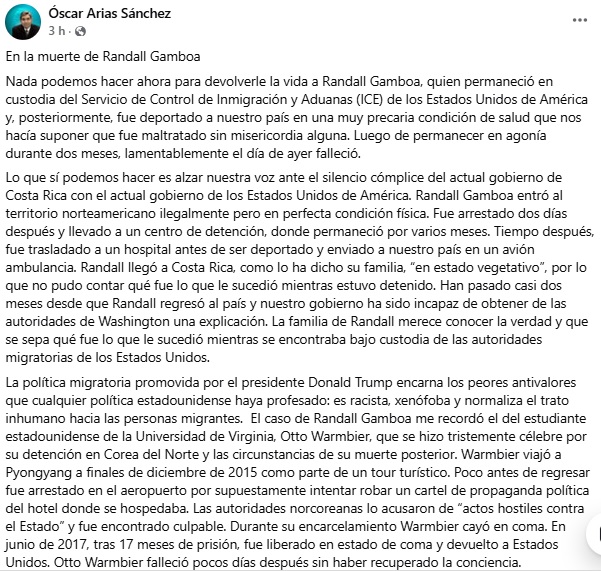 El expresidente de la República, Oscar Arias, mediante una publicación en Facebook, hizo fuertes cuestionamientos a los Gobiernos de Costa Rica y Estados Unidos por el manejo del caso de Randall Gamboa.