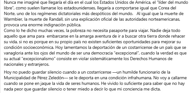 Costarricense falleció tras ser deportado de Estados Unidos en condición crítica. Expresidente Arias lanza críticas al gobierno tico y al norteamericano.