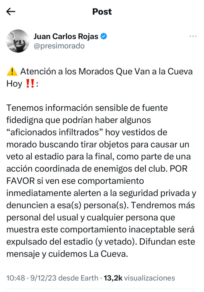 Presidente morado advirtió en su cuenta de “X” sobre presuntos infiltrados que se propusieron lanzar objetos y harán lo que puedan para que el Ricardo Saprissa sea vetado: