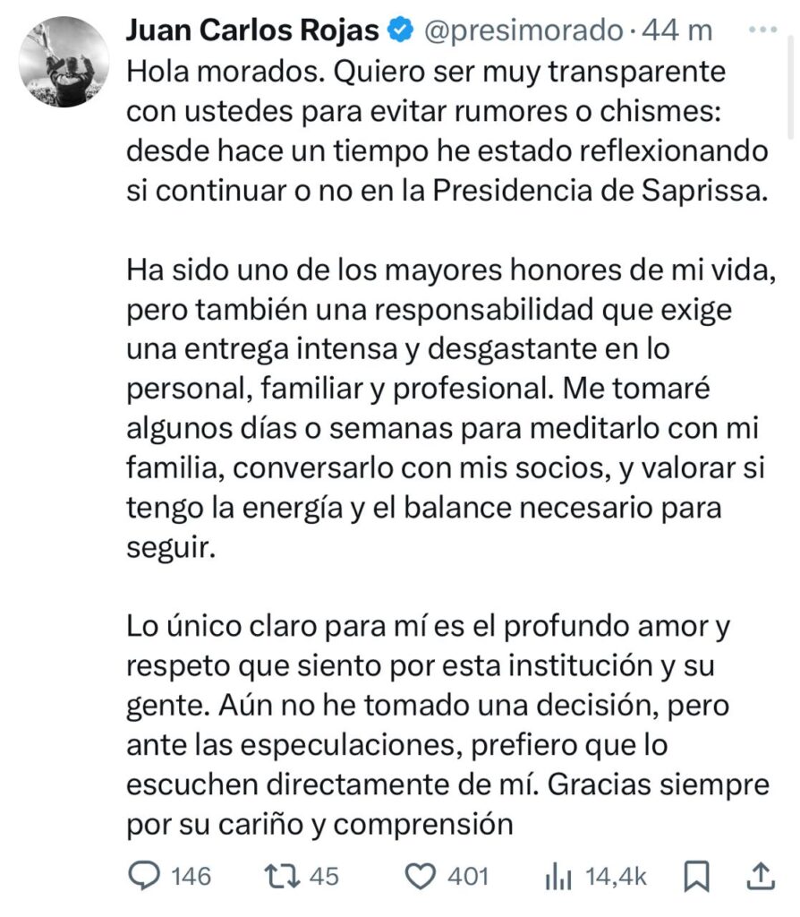 «Hola morados. Quiero ser muy transparente con ustedes para evitar rumores o chismes: desde hace un tiempo he estado reflexionando si continuar o no en la Presidencia de Saprissa.