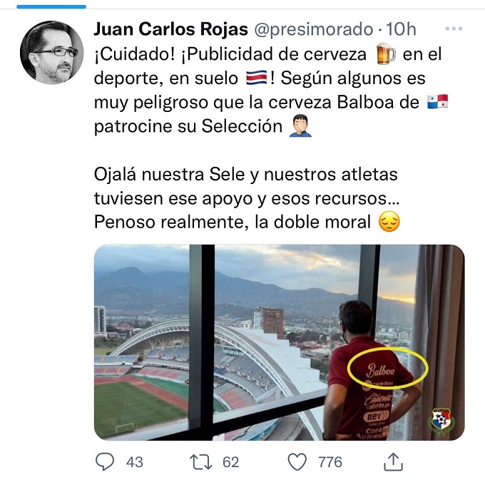 «¡Cuidado! ¡Publicidad de cerveza en el deporte, en suelo costarricense! Según algunos es muy peligroso que la cerveza Balboa de patrocine su selección», ironizó Rojas en su cuenta persona de Twitter, donde se observa al seleccionador canalero, el danés-español Thomas Christiansen observando desde el hotel donde se hospeda la grama del Estadio Nacional.