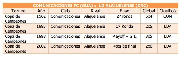 La primera vez que se enfrentaron en torneos oficiales, fue en la segunda ronda de Copa de Campeones de Concacaf 1962 el 15-abr-1962 en Ciudad de Guatemala, triunfo 3-1, para Comunicaciones con goles de Hugo “tin-tan” Peña x2 y Jerónimo Pericullo, y para Alajuelense anotó Guido Peña; en el juego de vuelta, en Alajuela el 29-abr-1962, los locales ganaron 3-2 con un hat-trick de Guido Peña y para Comunicaciones anotaron Obdulio Pensamiento y Hugo “tin-tan” Peña. Sin embargo, Alajuelense quedó eliminado en el marcador global 5-4.