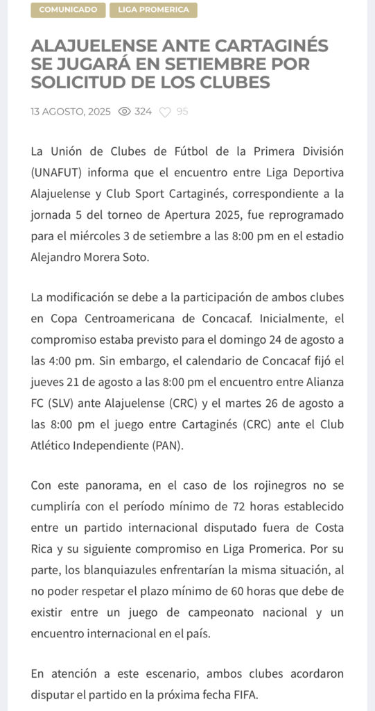 “El miércoles recibimos el acta oficial donde nos indican que por una petición unilateral, en este caso del Club Sport Cartaginés, ellos al no cumplir las 60 horas de espacio que tiene que tener un partido con otro, con relación a participación internacional, optan por solicitar la reprogramación”, expresó el personero manudo.