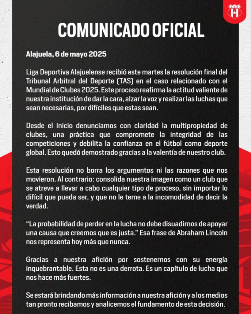 Este martes 06 de mayo se dio a conocer la no participación de la Asociación Liga Deportiva Alajuelense en el Mundial de Clubes 2025.