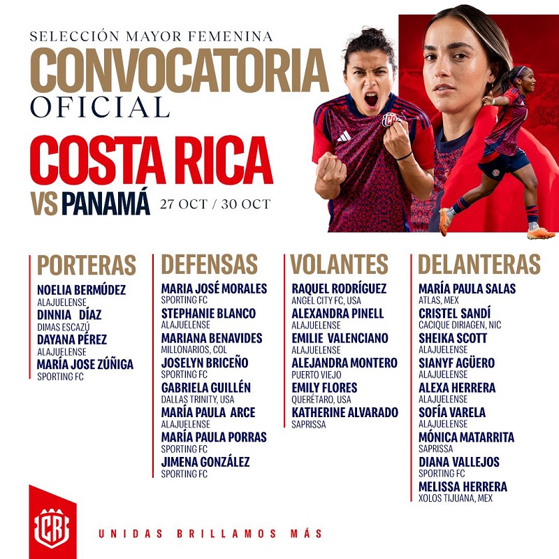 La siguiente es la lista de convocadas del DT Beni Rubido para los fogueos de la Selección Mayor Femenina que serán ante Panamá y no frente a Cuba, como se había informado en un principio. Los encuentros serán en el Estadio Alejandro Morera Soto el 27 de octubre y el 30 de octubre en el Complejo FCRF-Plycem.
