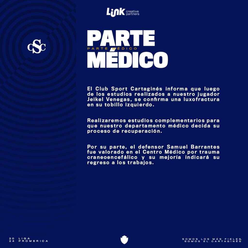 Antes de finalizar el juego que Cartaginés le ganó a Santos, 2 a 1, el jugador brumoso Jeykell Venegas abandonó la cancha llorando en camilla, tras sufrir un choque con el defensor Kendrick Henríquez. El departamento de prensa blanquiazul dio a conocer la gravedad de la lesión: