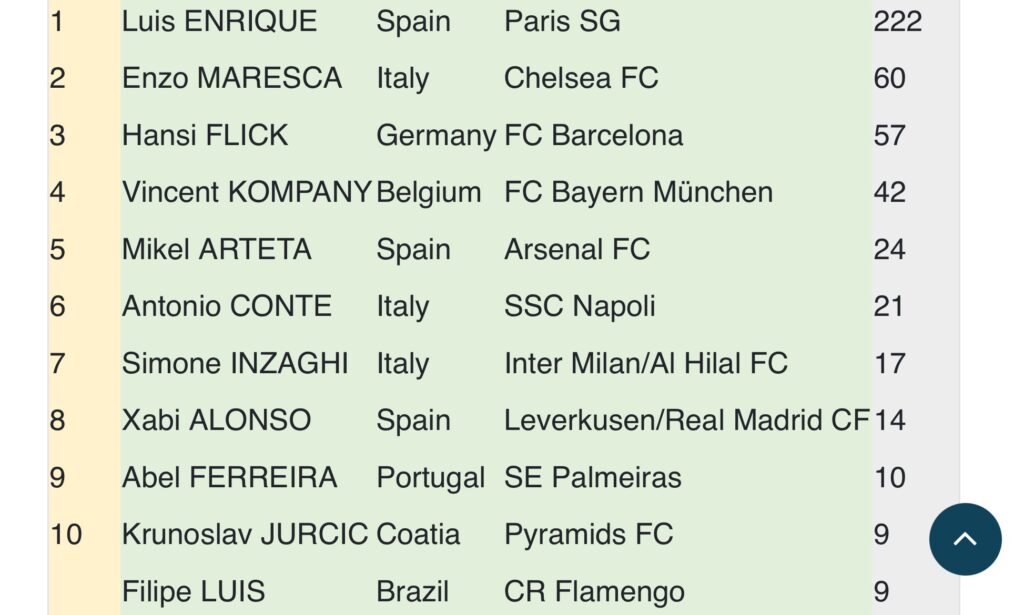 Tras él, Enzo Maresca, Hansi Flick, Vincent Kompany y Mikel Arteta hicieron grandes cosas en 2025 para unirse al Top 5 del Mundo.