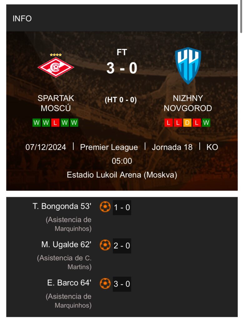 El Spartak de Moscú recibió al Nizhny Novgorod. Con Manfred Ugalde comandando el ataque, ganó 3-0 con una nueva anotación del ariete costarricense.