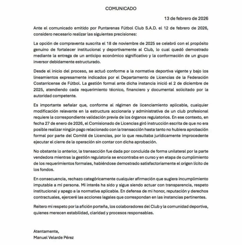 PUNTARENAS FC SIGUE BAJO LA ADMINISTRACIÓN DE LA FAMILIA MEDINA TRAS NO CONCRETARSE EL TRASPASO AL GRUPO EMPRESARIAL COMANDADO POR EL MEXICANO MANUEL VELARDE.