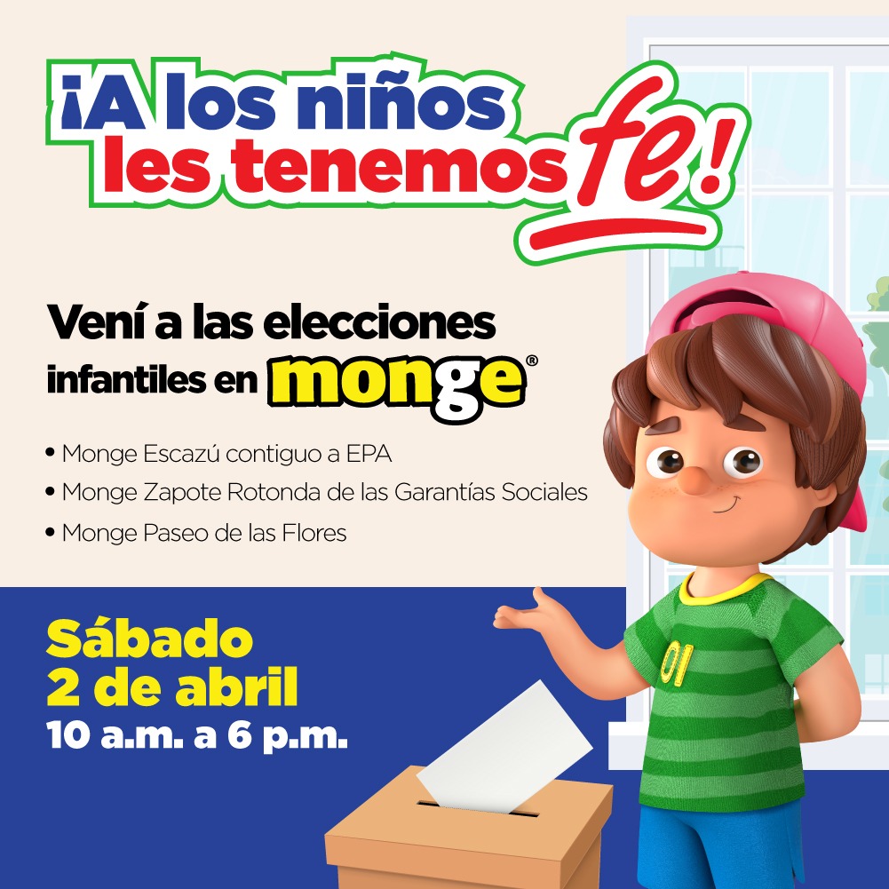 “Con esta iniciativa, en Monge queremos impulsar a los niños que visiten nuestras tiendas de Zapote, Escazú y Paseo de las Flores este sábado, para que ejerzan el derecho al voto y así, fomentar el respeto por las distintas ideologías presentes dentro de una democracia y, qué mejor manera de hacerlo que, permitiéndoles vivir una experiencia similar a la que tendremos los adultos, siguiendo los mismos lineamientos que habrá en las elecciones nacionales a realizarse este domingo”, comentó Carlos Fernández, Gerente de Marca Monge.