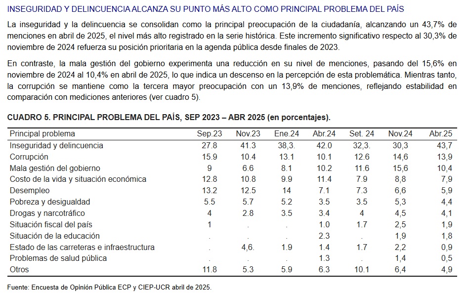 «La inseguridad y la delincuencia se consolidan como la principal preocupación de la ciudadanía, alcanzando un 43,7% de menciones en abril de 2025, el nivel más alto registrado en la serie histórica», dice el reporte.