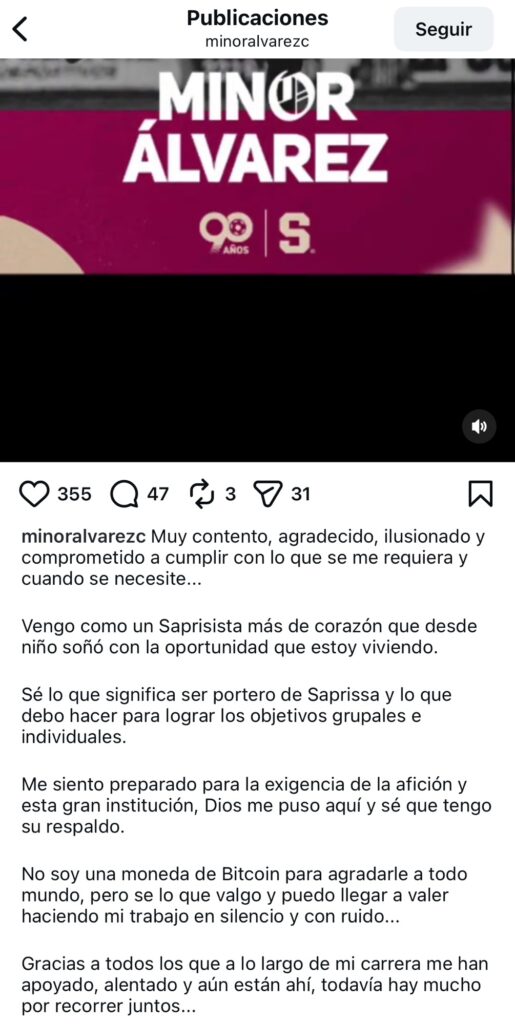 «Estoy muy contento, agradecido, ilusionado y comprometido a cumplir con lo que se me requiera y cuando se necesite. Vengo como un saprissista más de corazón que desde niño soñó con la oportunidad que estoy viviendo. Sé lo que significa ser portero de Saprissa y lo que debo hacer para lograr los objetivos grupales e individuales», escribió el guardameta en su cuenta de Instagram.