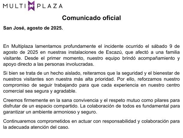 Multiplaza emitió un comunicado de prensa la tarde de este lunes en el cual lamentó lo ocurrido y calificó la situación como «un hecho aislado».