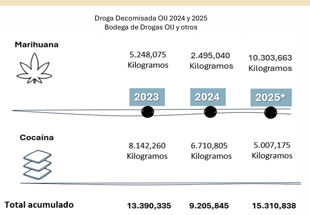 El OIJ pasó de 9,2 toneladas en 2024 a 15,3 toneladas en el 2025. El salto se da principalmente por un incremento de un 313% en las incautaciones de marihuana.