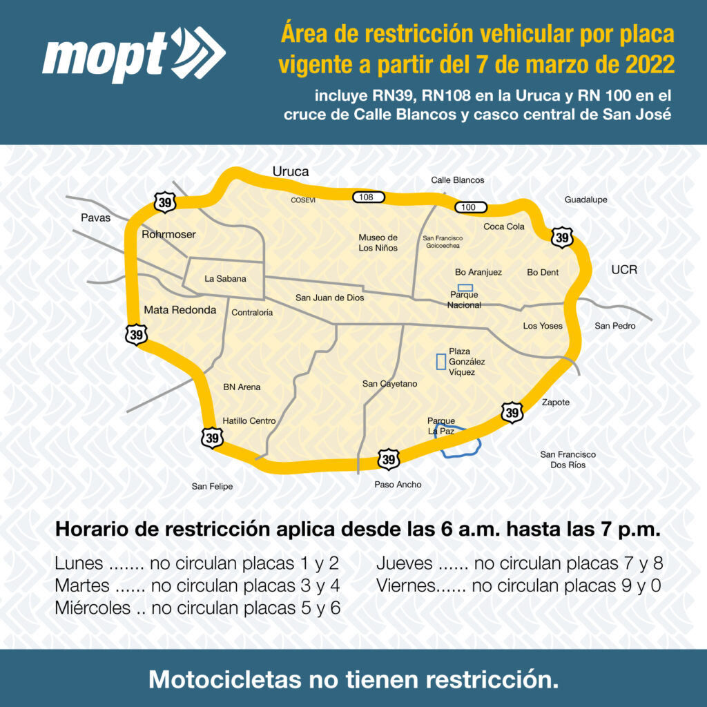 Ahora, regresa la restricción vehicular ya conocida, desde antes de la pandemia. Dos placas por día tendrán impedimento para transitar por Circunvalación y el centro de San José, de 6 de la mañana a 7 de la noche.