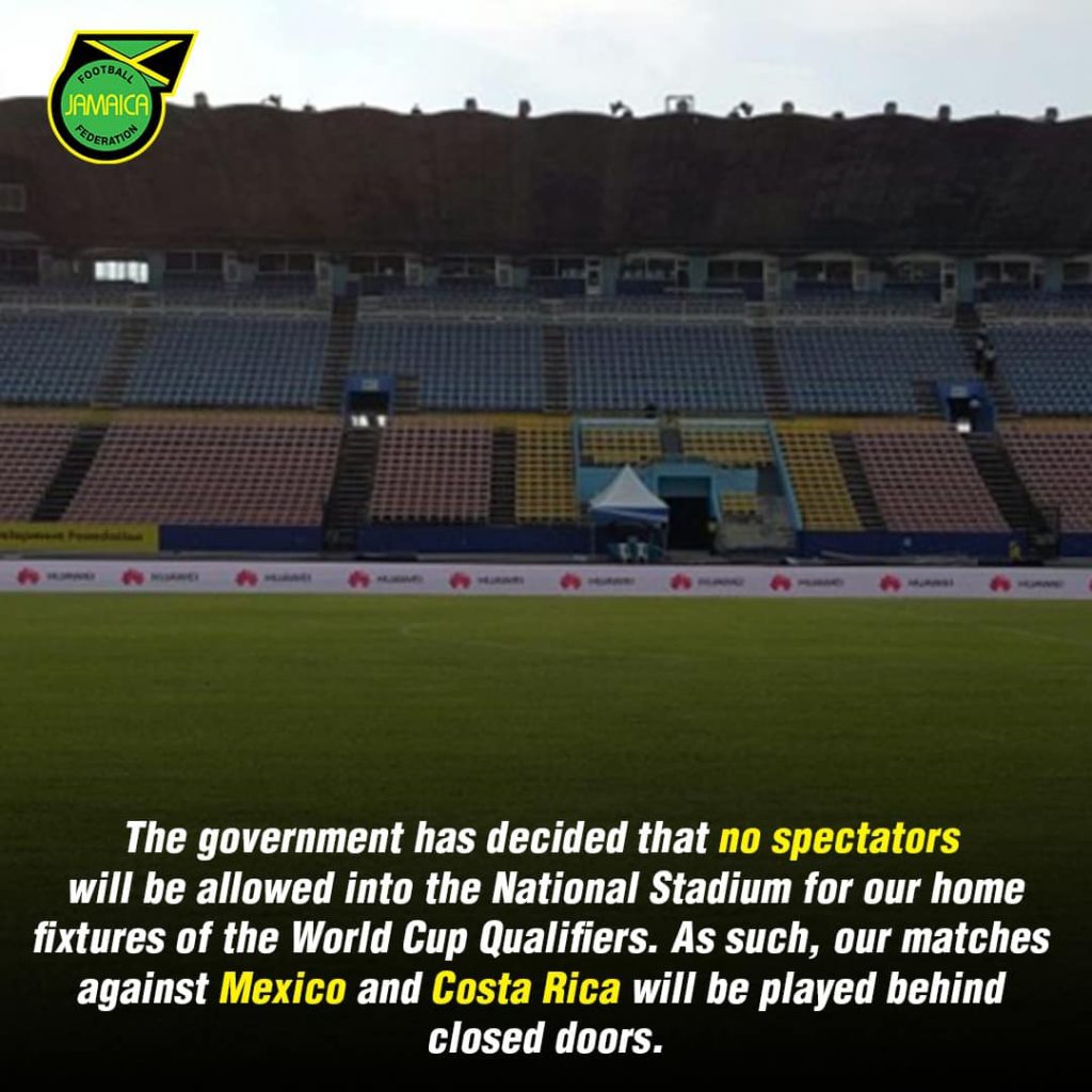 “El Gobierno ha decidido que no serán aceptados espectadores en el estadio Nacional para los partidos eliminatorios como local”, informó la Federación Jamaiquina de Fútbol.