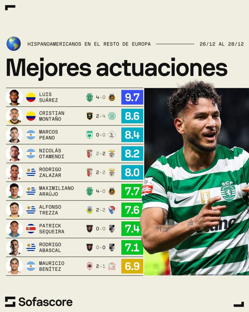La plataforma de estadísticas Sofascore publicó la lista de jugadores hispanoamericanos más destacados del último fin de semana en el mundo europeo: