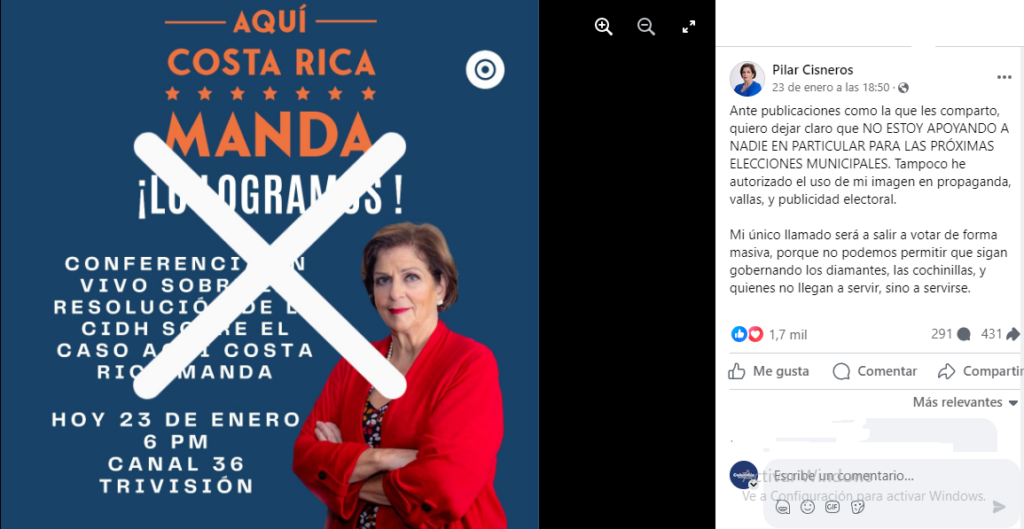 «Ante publicaciones como la que les comparto, quiero dejar claro que NO ESTOY APOYANDO A NADIE EN PARTICULAR PARA LAS PRÓXIMAS ELECCIONES MUNICIPALES. Tampoco he autorizado el uso de mi imagen en propaganda, vallas, y publicidad electoral. Mi único llamado será a salir a votar de forma masiva, porque no podemos permitir que sigan gobernando los diamantes, las cochinillas, y quienes no llegan a servir, sino a servirse», escribió en una publicación con logos de la agrupación en la que se anunciaba una conferencia sobre el tema electoral.