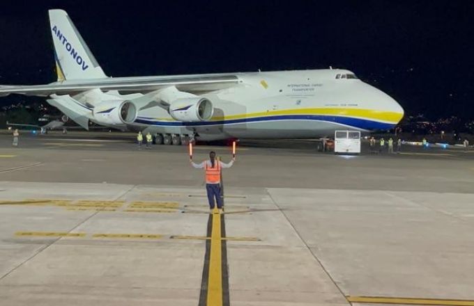 El enorme avión de carga llegó a las 6:55 p.m. a Costa Rica, en las afueras del aeropuerto había un numeroso grupo de personas que llevaron banderas, globos y carteles con los colores amarillo y azul de la bandera de Ucrania. Adicionalmente los vehículos pusieron sus luces intermitentes.