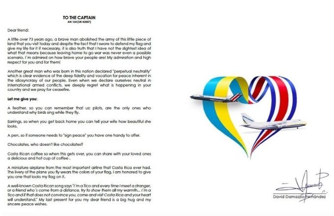 Por esta razón, el piloto decidió alistar la carta y los regalos con la esperanza de poder entregarlos personalmente y transmitir un mensaje de apoyo a los 19 ucranianos de la aeronave.
