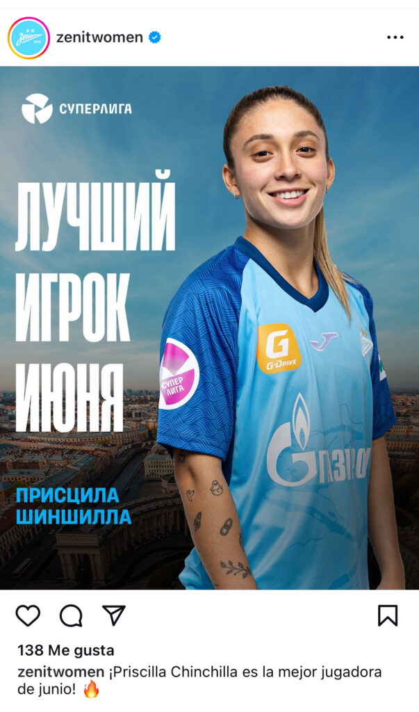 Esto le valió ser declarada Jugadora de Junio por la afición del Zenit en redes sociales: