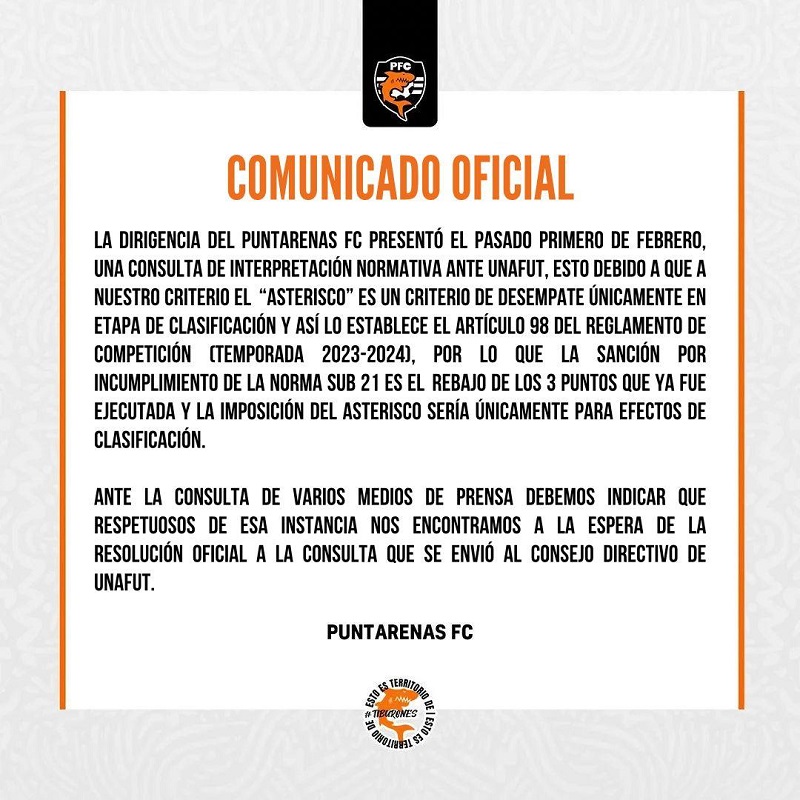 Esta aclaración ha sido comunicada tanto al Puntarenas FC, como al resto de clubes, para que tengan presente esta disposición de la normativa vigente en relación con el descenso.