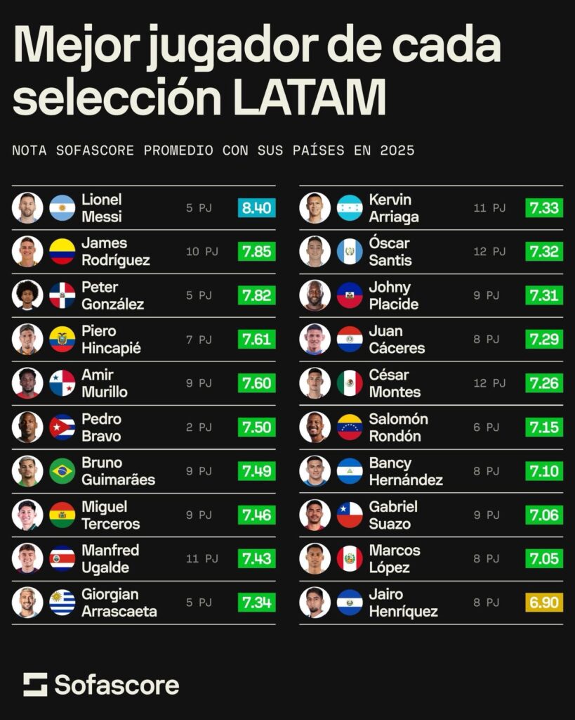 Estos son los mejores jugadores de cada selección latinoamericana en 2025 según las puntuaciones de Sofascore, plataforma internacional especializada en estadísticas deportivas.