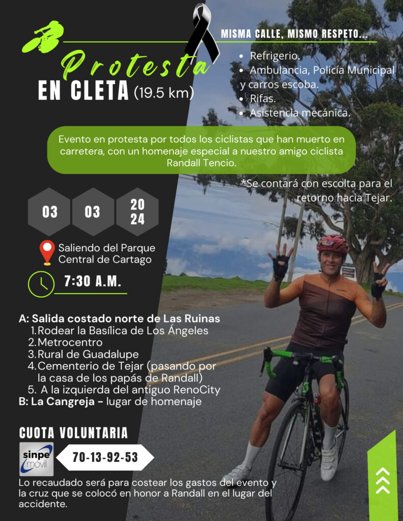 «‘La protesta en cleta’ consta de una recreativa que está siendo organizada por los ciclistas de Cartago, en donde se le va a rendir homenaje a todos los ciclistas que han perdido la vida en carretera, especialmente a Randall Tencio. El pasado 30 de enero Randall sufrió un accidente mientras practicaba ciclismo en la zona de La Cangreja, mismo accidente por el cual, una semana después, fue declarado sin vida. Su vida y la de todos aquellos ciclistas que la han perdido son el motivo principal para alzar la voz, para exigir justicia y respeto en carretera», dijo.
