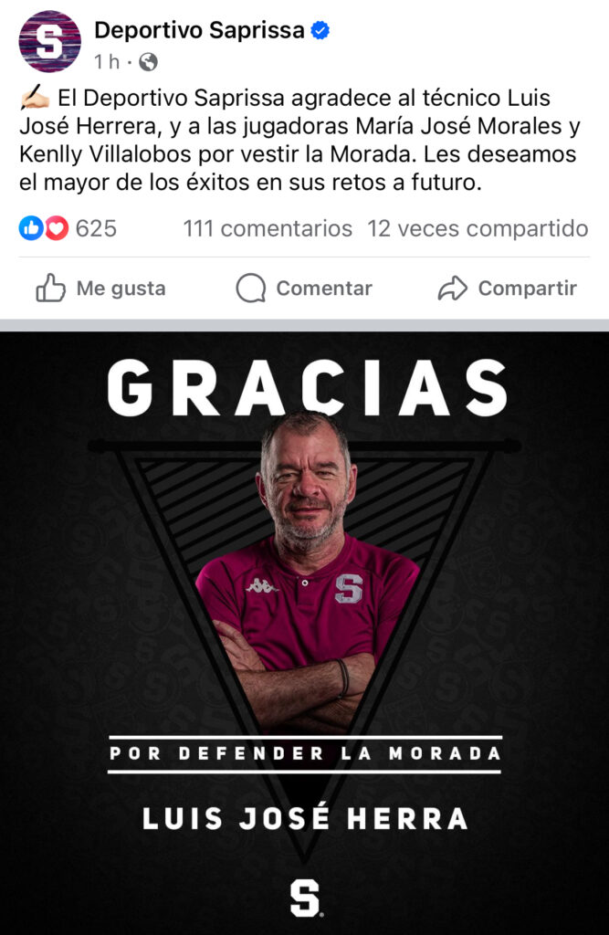 “El Deportivo Saprissa agradece al técnico Luis José Herra”, publicó el cuadro morado en su Facebook.