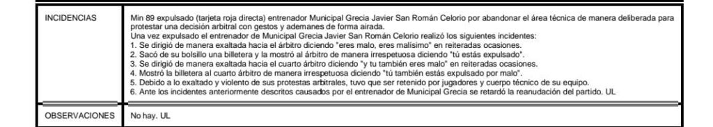 Luego de ser expulsado en el juego ante Guanacasteca, el técnico de Grecia, Javier San Román le mostró la billetera a los árbitros y manifestó algunas frases ofensivas que se registran en el informe al que Columbia tuvo acceso.