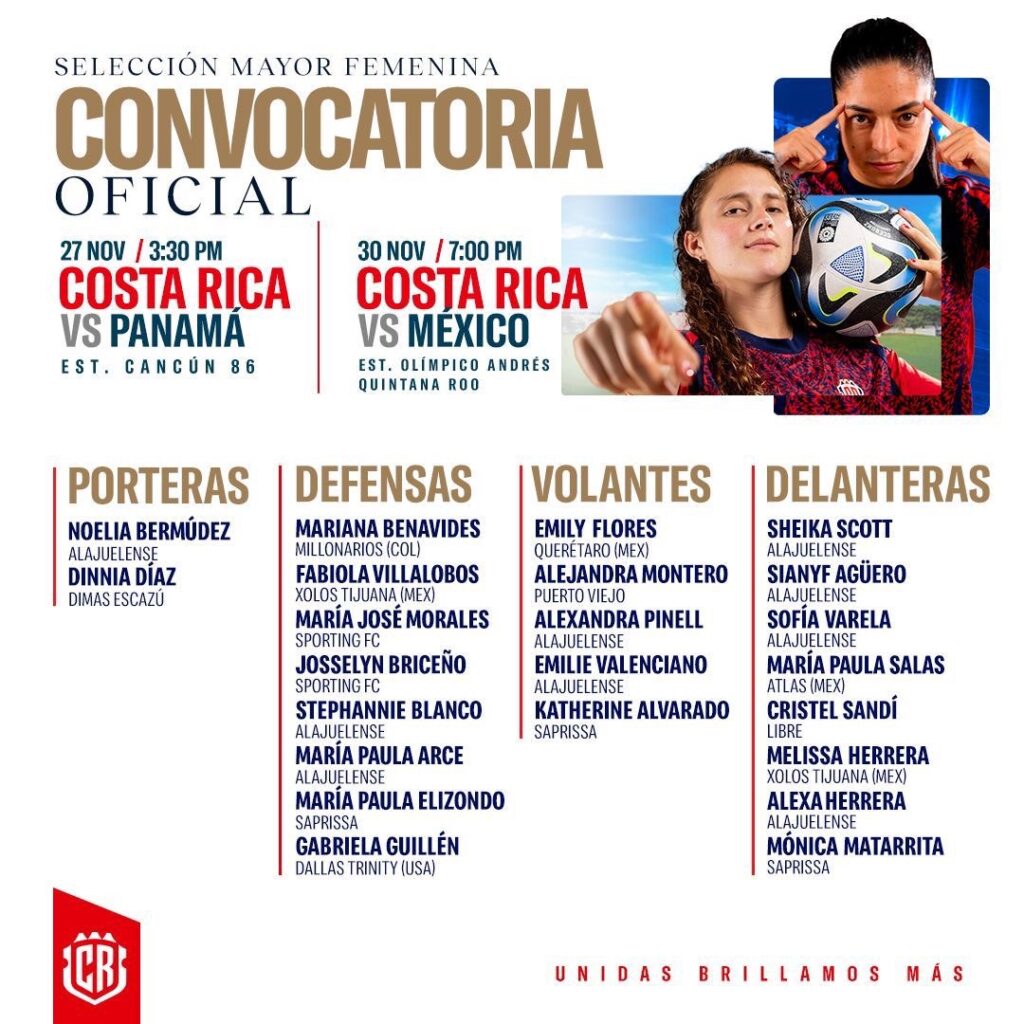 La Federación Costarricense de Fútbol divulgó la lista de 23 convocadas por el DT Beni Rubido para los fogueos de la Selección Mayor Femenina ante Panamá y México en Cancún, México.