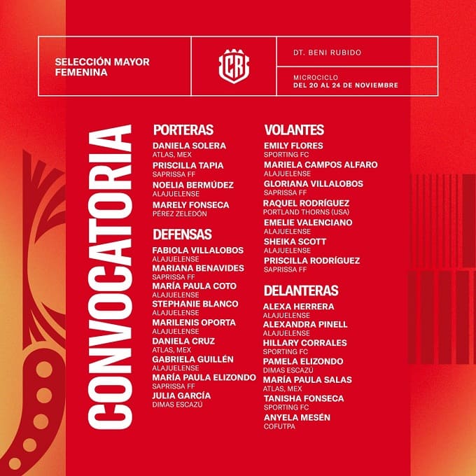 El profesor Beni Rubido dará a conocer la lista definitiva de 23 jugadoras para la fecha FIFA este jueves. Luego del duelo ante Haití el 30 de noviembre en el Estadio Morera Soto, el equipo permanecerá concentrado para el siguiente y definitivo juego el 4 de diciembre en San Cristóbal y Nieves.