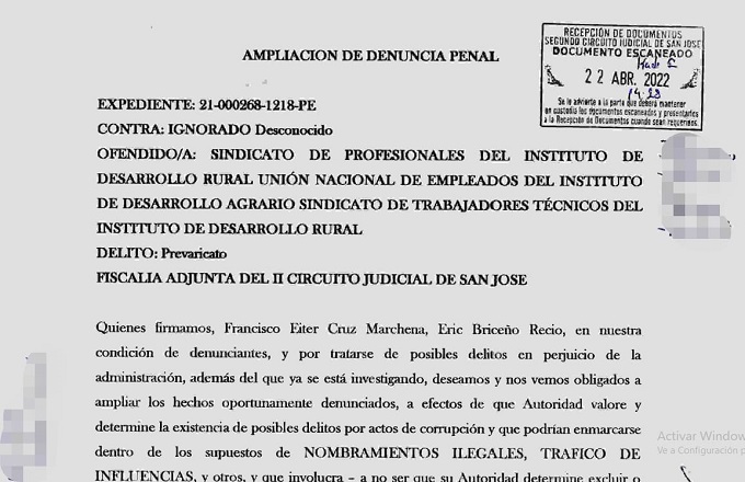 La denuncia ante el Ministerio Público está acompañada de cartas que los sindicatos enviaron a la Contraloría, la Procuraduría, el presidente ejecutivo del Inder y la Junta Directiva de la institución.