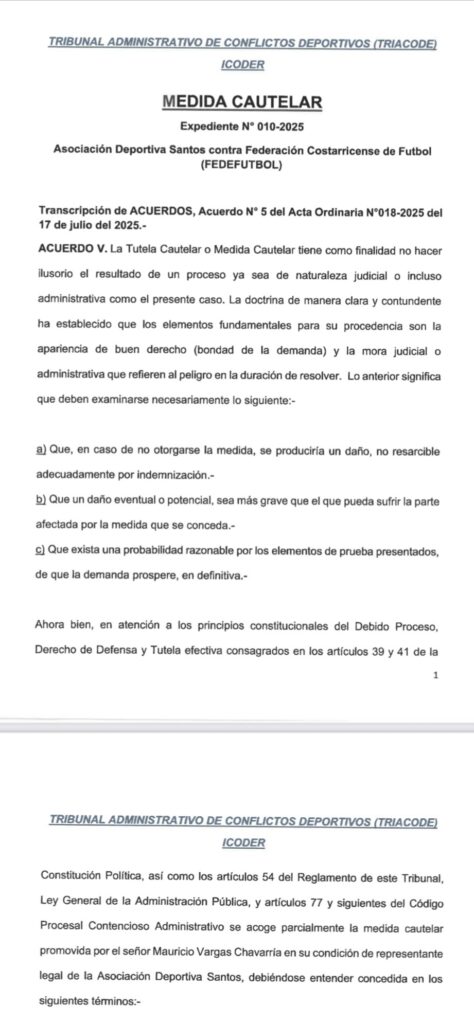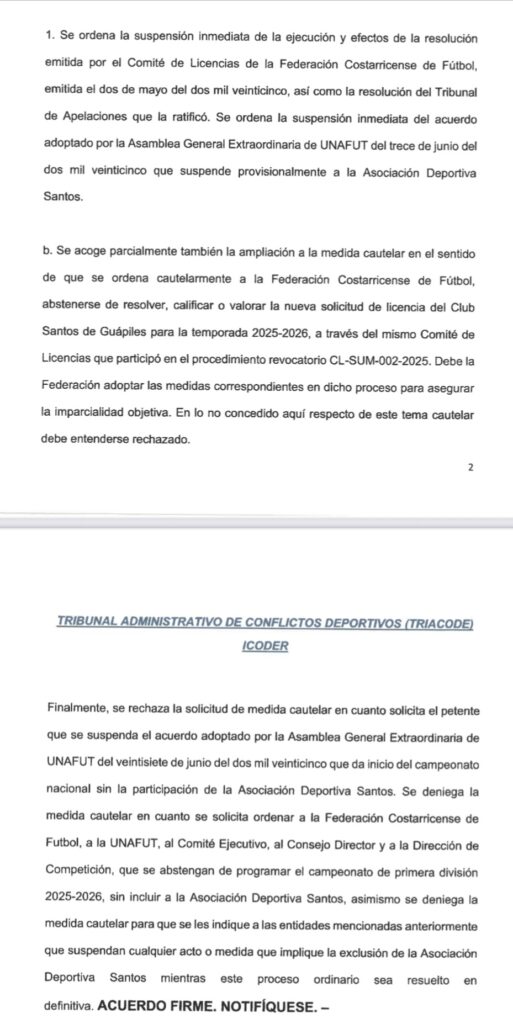 “Se rechaza la solicitud de medida cautelar en cuanto solicita el petente que se suspenda el acuerdo adoptado por la Asamblea General Extraordinaria de UNAFUT del veintisiete de junio del dos mil veinticinco que da inicio del campeonato nacional sin la participación de la Asociación Deportiva Santos”.
