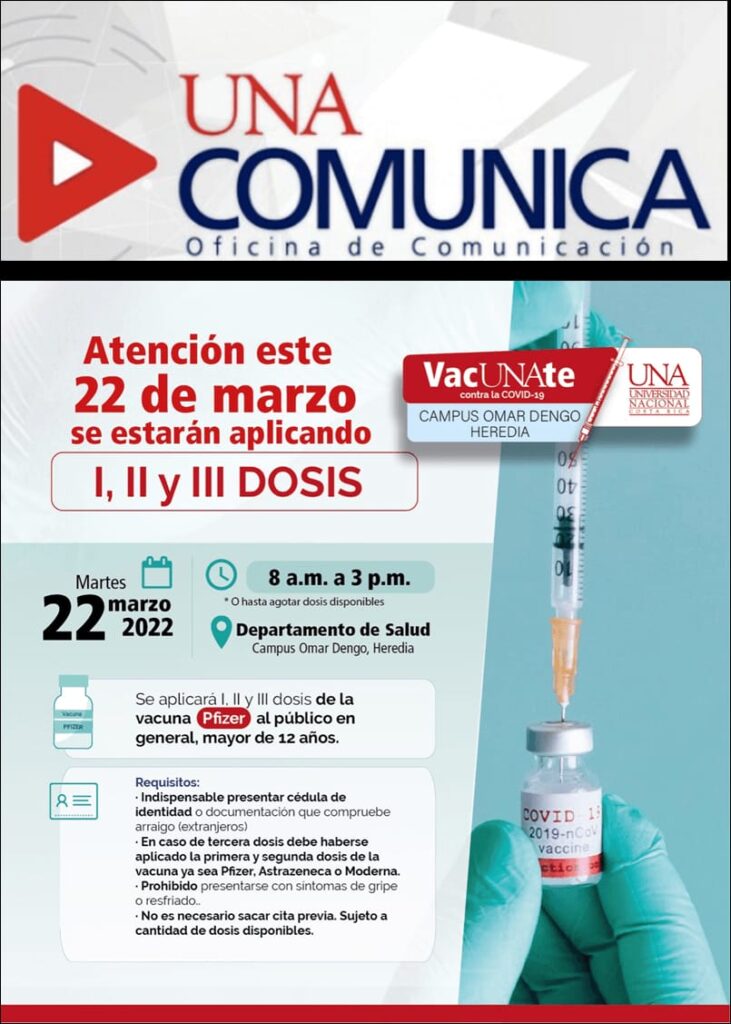 La Universidad Nacional (UNA) estará aplicando vacuna contra Covid-19 durante este martes 22 de marzo tanto para primeras, segundas y terceras dosis.