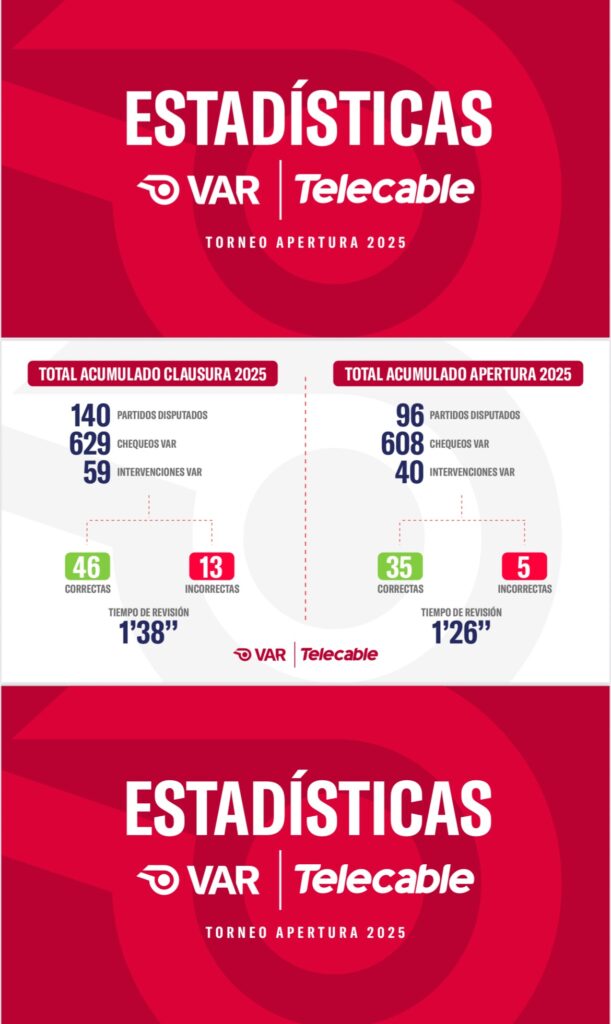 La Comisión de Arbitraje publicó las estadísticas correspondientes al torneo de Apertura 2025 y las estadísticas comparativas entre el torneo de Clausura y Apertura del año pasado del VAR Telecable.