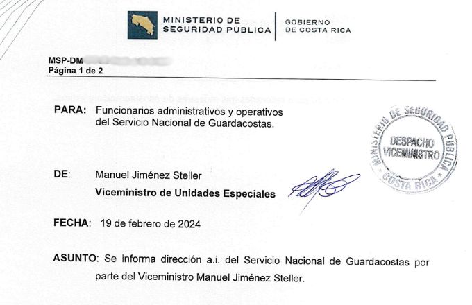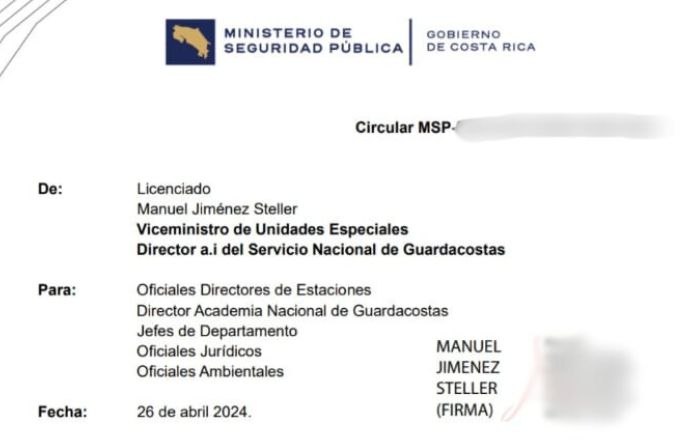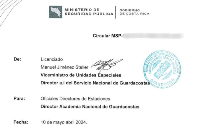 Noticias Columbia tuvo acceso a cuatro circulares y dos oficios que Jiménez Steller firmó como director interino del Servicio Nacional de Guardacostas. Los documentos fueron emitidos entre marzo y mayo de este año.